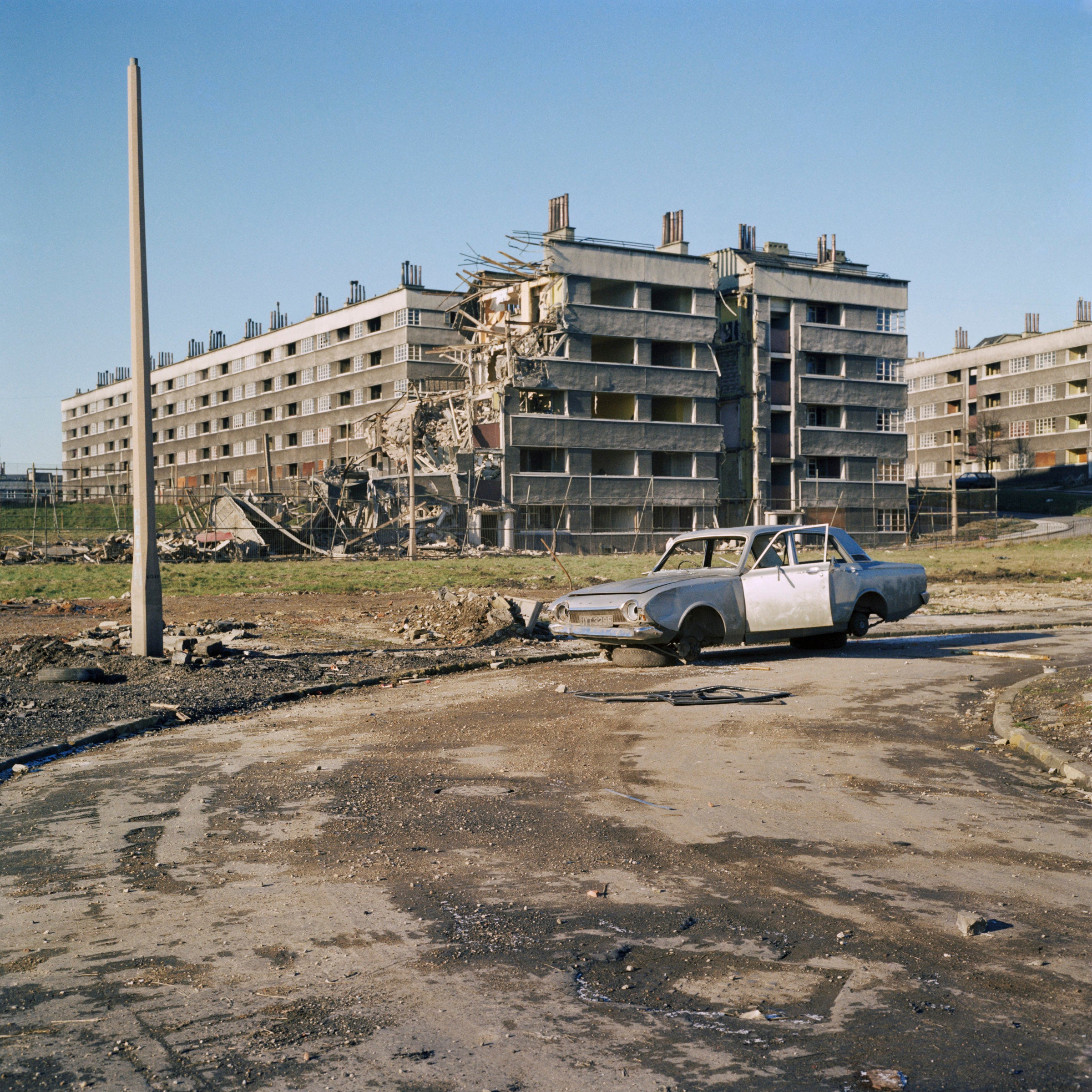 Abandoned car, Wright House, Quarry Hill Flats, Leeds, 1978